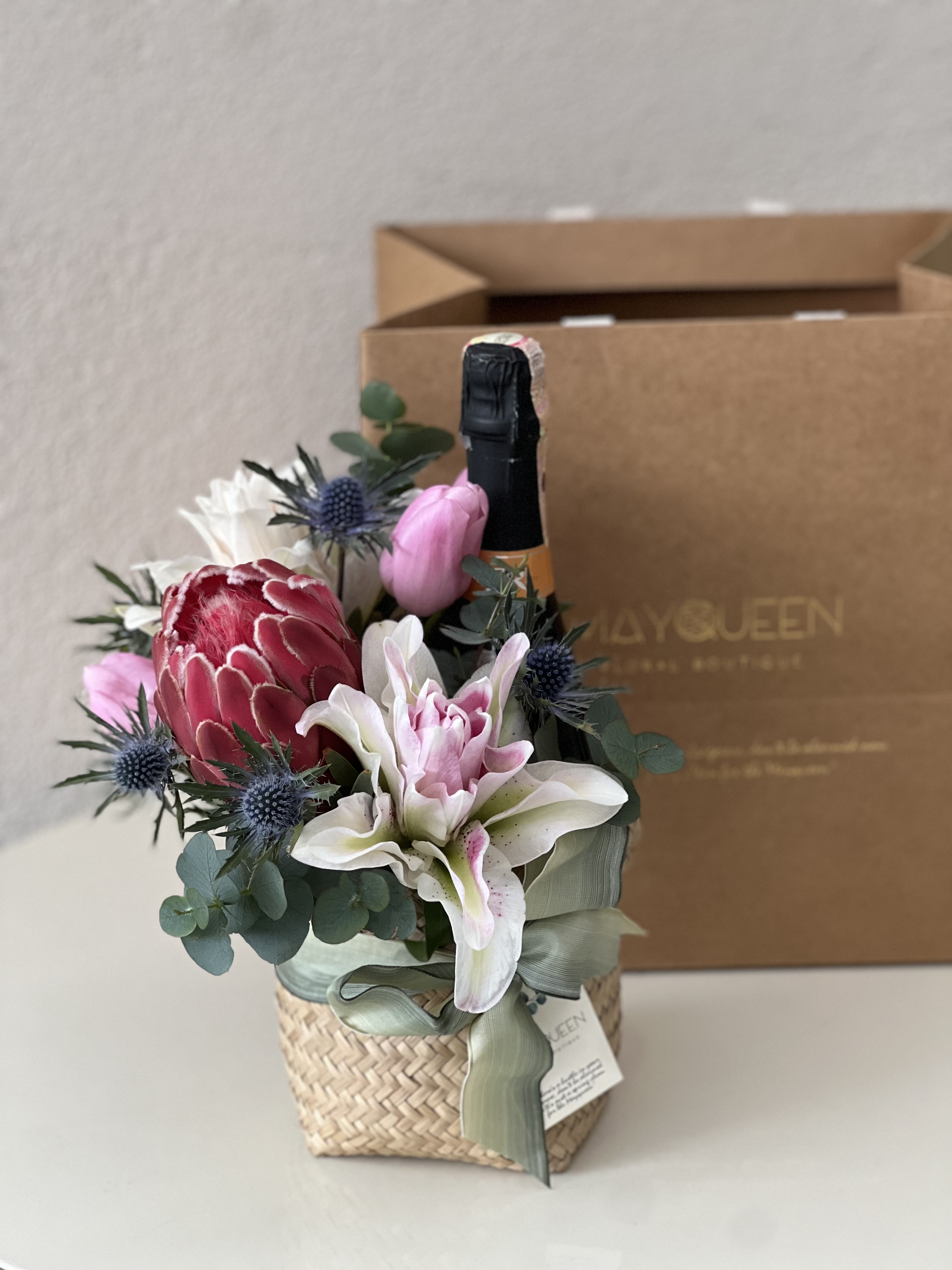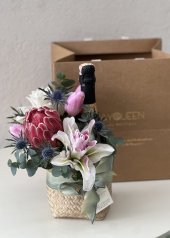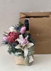 MİNİ SEPETTE İÇECEK VE ÇİÇEKDEN LUŞAN HEDİYE SEPETİ.