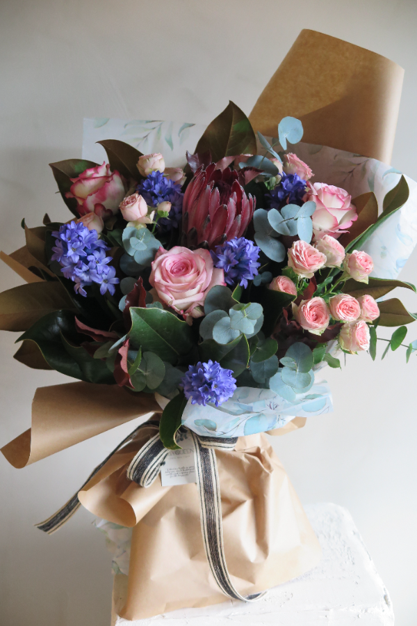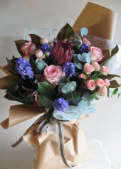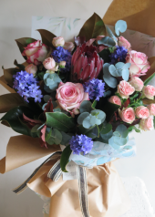 Protea, gül, sümbül,çardak gülü, manolya yaprağı ve okaliptüs ile hazırlanmış kış buketi