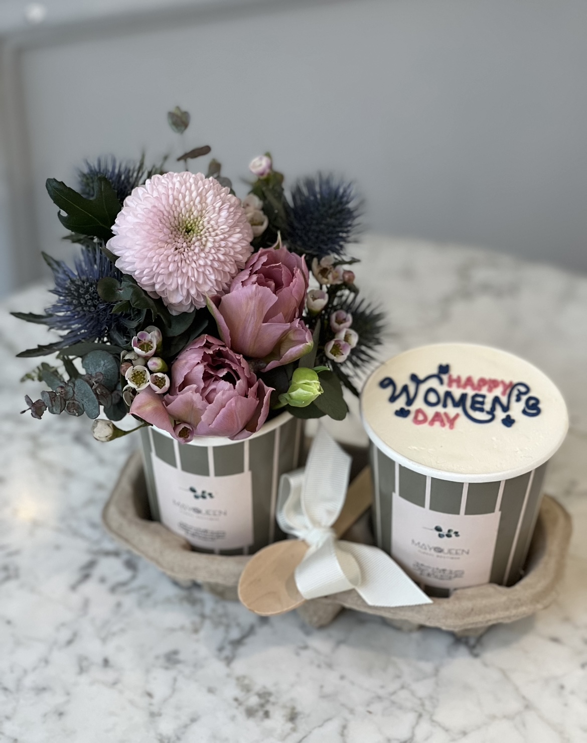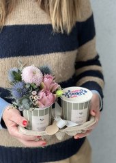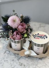 Kahve bardağında pembe ithal çiçeklerle hazırlanmış arajman ve pasta paketi.Pasta siparişinize özel günlük olarak hazırlanmaktadır.