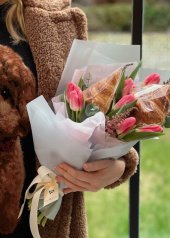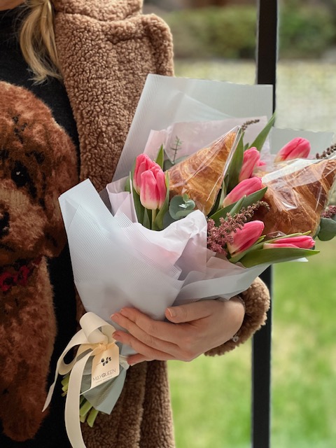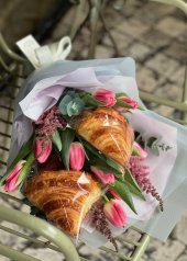 Lale buketine lezzet kattık; 2 adet Pelin'in ekmeği kruvasan, lale ve astilbe