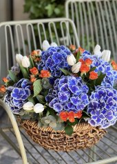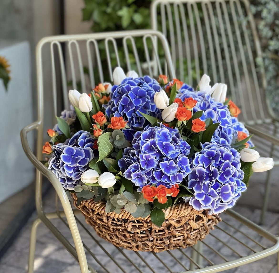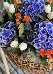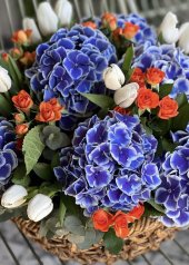 Mor beyaz renkli ortancaları beyaz laleler ve turuncu çardak gülleri ile kombinleyerek , tatlı bir sepet içerisinde sunduk. Büyük boy, enerjik ve  renkli bir hediye alternatifidir.