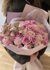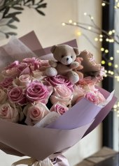 30 ADET PEMBE GÜL İLE HAZIRLANMIŞ BUKET ÜZERİNDE 1 ADET AYICIK VE 1 ADET KALP ŞEKLİNDE FOLYO BALON BULUNMAKTADIR.