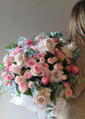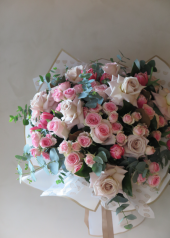Ekvator gülleri, çardak gülleri ve columbus laleler ile hazırlanmış buket.