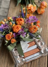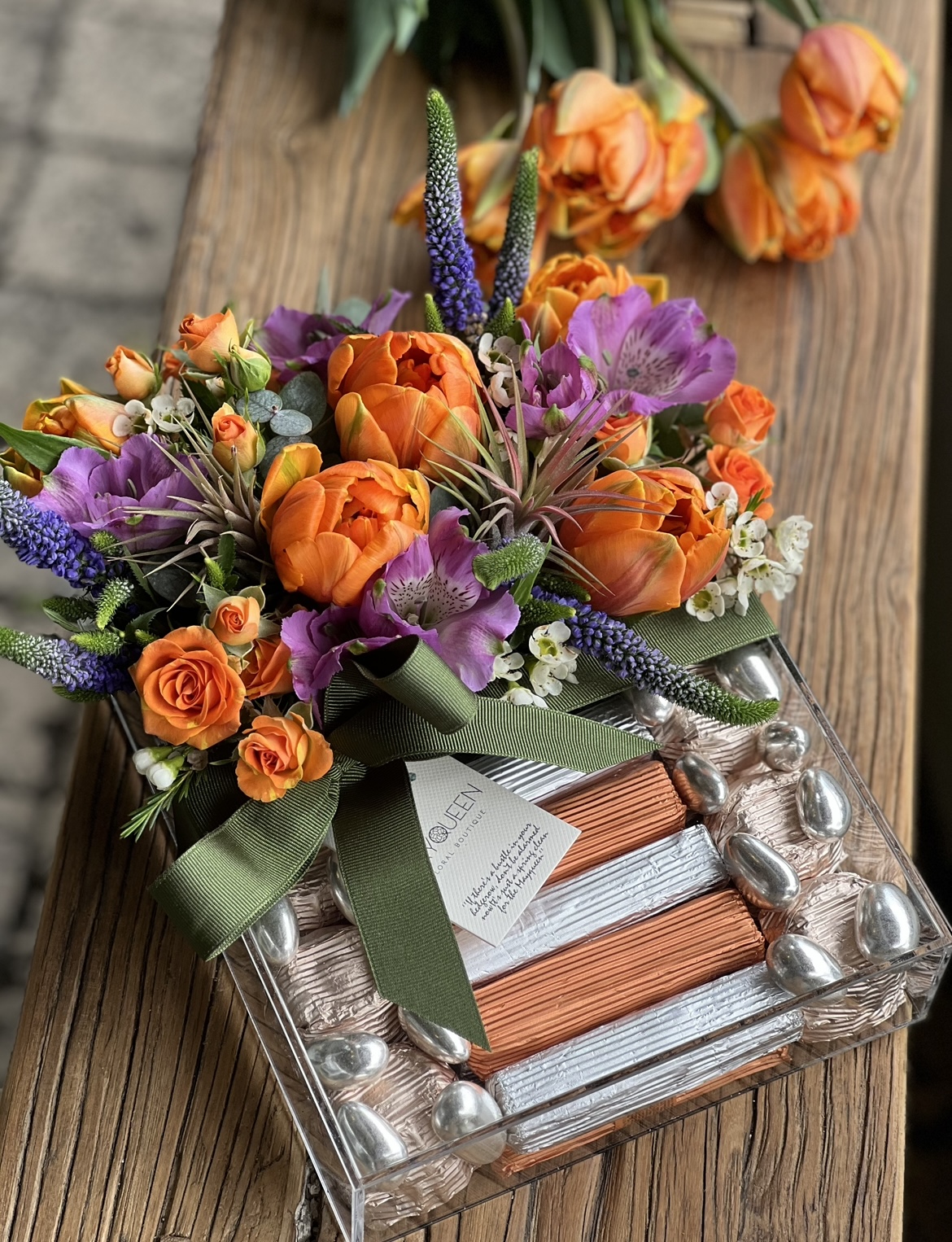 Sade, şık ve lezzetli. Lale, alstomeria ve veronica ile hazırlanmış, çikolata kutusu.Sezon ve stok durumunagöre kullanılan çiçeklerin remk ve çeşidinde farklılık olabilmektedir.